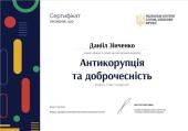 Ад’юнкт відділу аспірантури (ад’юнктури) і докторантури Харківського національного університету внутрішніх справ Данііл ЗІНЧЕНКО успішно пройшов онлайн-курс на освітній платформі Study.NAZK за темою «Антикорупція та доброчесність». Під час навчання були розглянуті ключові принципи антикорупційної політики, етичні стандарти поведінки публічних службовців, а також практичні аспекти запобігання та протидії корупції.