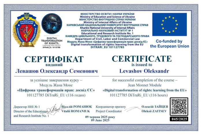 Науково-педагогічний склад кафедри мовної підготовки – завідувачка кафедри Олена СТАТІВКА, доценти Олександр ЛЕВАШОВ, Валентина ПОЧУЄВА, Валентина КОЧИНА та старша викладачка Лариса САЗАНОВА, а також доцентка кафедри теорії та історії держави та права Олена ЮШКЕВИЧ пройшли курс Модуль Жана Моне «Цифрова трансформація прав: досвід ЄС». Вони поглибили знання у сфері прав людини в інтернеті, безпеки цифрових державних послуг і захисту прав дітей у цифровому просторі ЄС. Усі учасники успішно склали підсумковий тест та отримали сертифікати про завершення курсу.