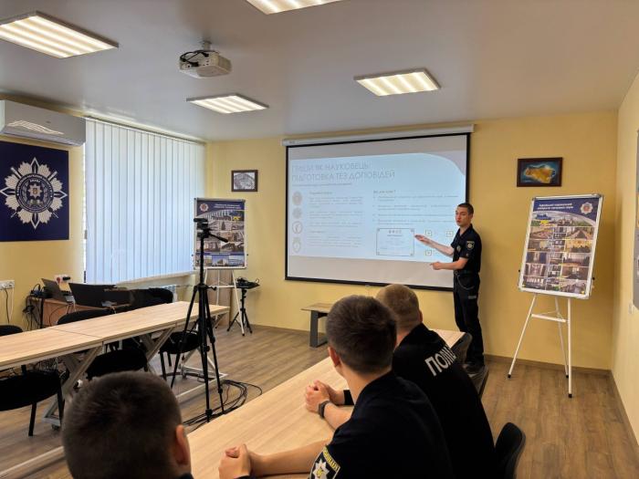 Презентацію провів автор проєкту – курсант 2 курсу ННІ №4 Олександр МОЙКО. Він проаналізував зміст освітньої програми, окреслив ключові етапи її створення, розповів про труднощі, які виникали під час роботи, а також продемонстрував макет сертифіката, що отримають після успішного проходження навчання.