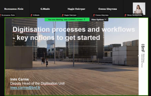 Заступниця завідувача загальної бібліотеки Олена СВІТЛАКОВА та начальниця відділу електронних ресурсів та сервісів Надія ОНІСТРАТ стали учасницями онлайн-семінару «Експертна місія TAIEX. Сучасна стратегія розвитку бібліотек: європейські рекомендації». Семінар організовано у межах проєкту міжнародної технічної допомоги TAIEX за ініціативи Конституційного Суду України у співпраці з Національною бібліотекою Франції.