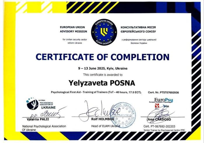 Психологиня відділення психологічного забезпечення відділу кадрового забезпечення Єлизавета ПОСНА взяла участь в тренінговому курсі підготовки тренерів з надання першої психологічної допомоги (40 годин, 17,5 кредитів ECTS), який проводився силами Європейської жандармерії та організований Консультативною місією Європейського Союзу з реформування сектору цивільної безпеки України (КМЄС в Україні).