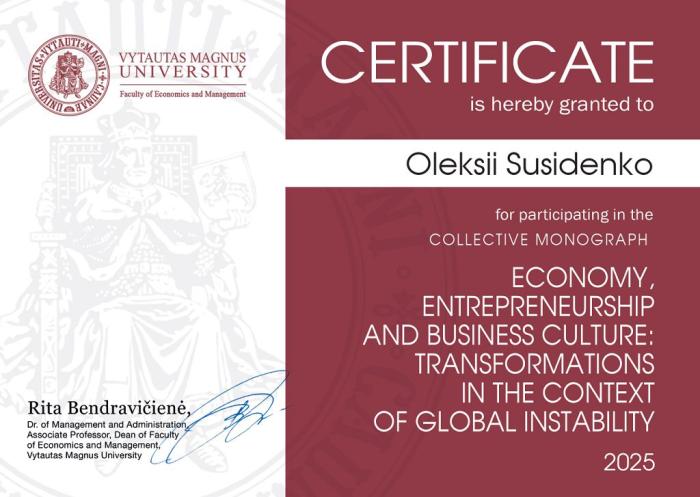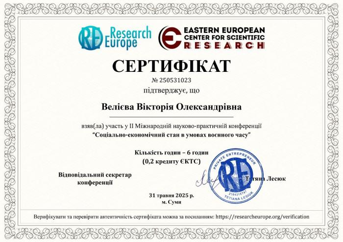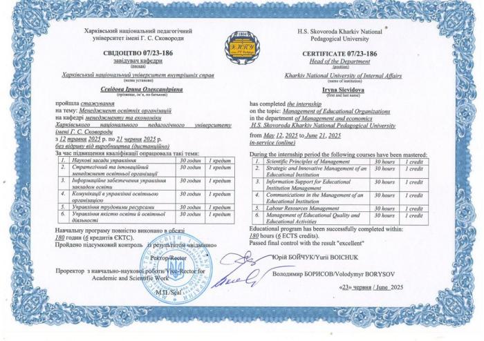 Таким чином, систематичне підвищення кваліфікації викладачів кафедри соціальних та економічних дисциплін, активна участь у наукових заходах сприяють розвитку науково-методичного потенціалу, підвищенню якості освітнього процесу та формуванню конкурентоспроможного фахівця в умовах сучасного освітнього середовища.