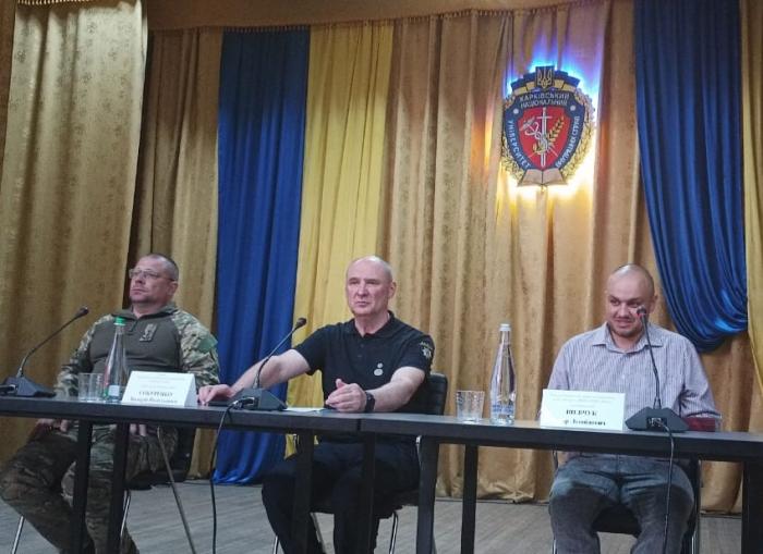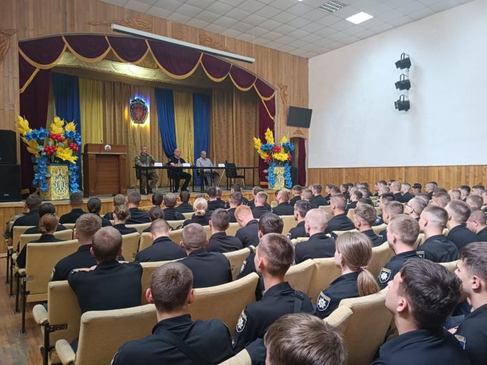 На зустрічі були присутні ректор університету, генерал поліції третього рангу Валерій СОКУРЕНКО, помічник начальника Департаменту поліції особливого призначення ОШБ «Лють», підполковник поліції Вячеслав ВУСІНСЬКИЙ, здобувачі вищої освіти та науково-педагогічні працівники.