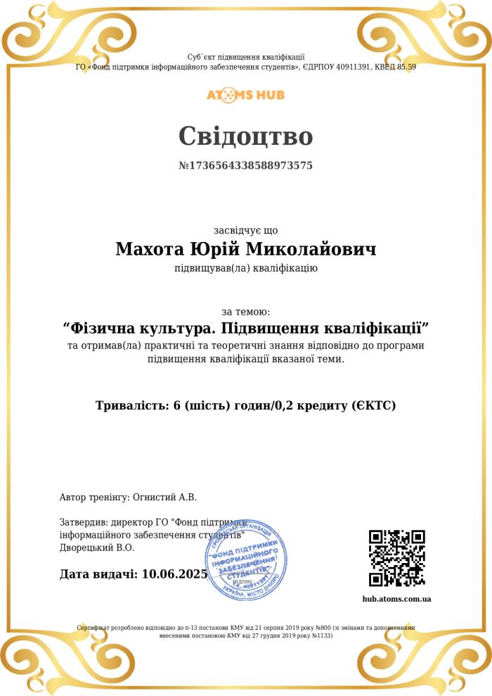 Так, начальник циклу тактико-фізичної підготовки Юрій МАХОТА успішно завершив онлайн-курси підвищення кваліфікації з фізичної культури. Отримані знання та сучасні підходи до організації фізичної підготовки дозволять йому ефективно готувати слухачів до служби в умовах підвищених фізичних і психологічних навантажень. Крім того, він опанував програму «Основні поняття з військової справи та основ цивільного захисту», що дозволяє більш глибоко інтегрувати питання національної безпеки в освітній процес.