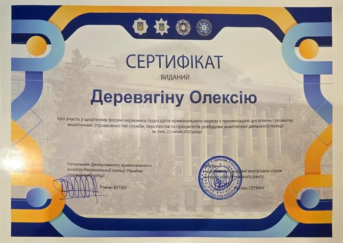 Науково-педагогічні працівники кафедри оперативно-розшукової діяльності та розкриття злочинів ННІ №2 – професор Олексій ДЕРЕВЯГІН і старший викладач Валерій ТЕМРІЄНКО долучилися до третього щорічного форуму «Актуальні питання та перспективи розвитку кримінального аналізу в правоохоронній системі України», де розглядалися питання щодо реалізації стратегії майбутнього розвитку підрозділів кримінального аналізу Національної поліції України.