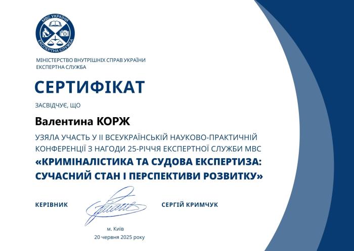 За такою темою відбулася ІІ Всеукраїнська науково-практична конференція, до якої долучилися представники кафедри кримінального процесу, криміналістики та експертології ННІ №5 – завідувач кафедри, доктор юридичних наук, професор Михайло ЩЕРБАКОВСЬКИЙ, професорка, докторка юридичних наук, професорка Валентина КОРЖ і доцентка, кандидатка психологічних наук, доцентка Світлана ЛОЗОВА. Освітній захід відбувся з нагоди 25-річчя Експертної служби МВС України.