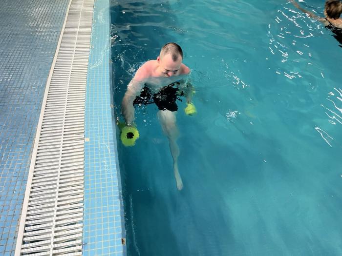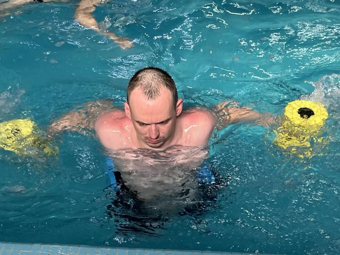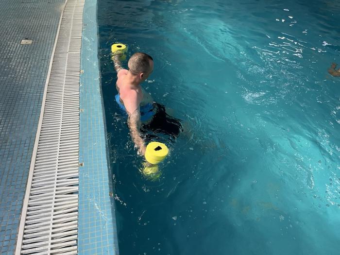 Чергове індивідуальне заняття з реабілітаційного плавання для молодшого сержанта Національної гвардії України, бійця батальйону спеціального призначення «Донбас» Артема КРИЧКОВСЬКОГО провів старший викладач кафедри спеціальної фізичної підготовки ННІ №2 Ігор ОСТРОВСЬКИЙ.