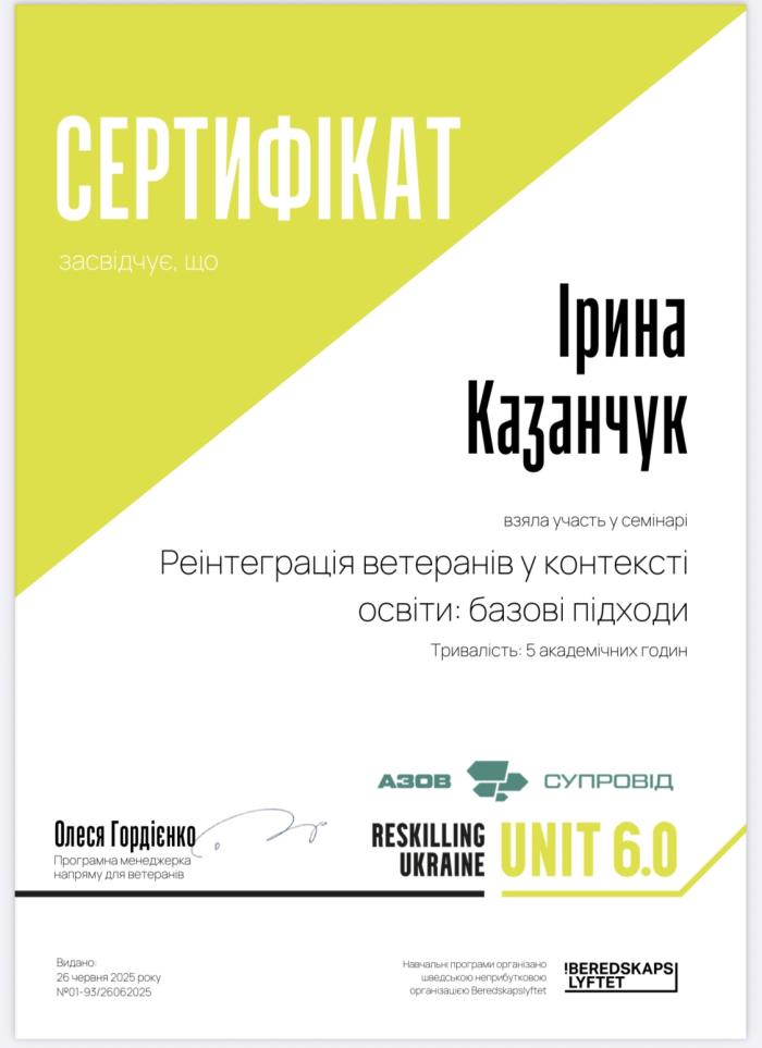 Окрім того, учасники отримали практичні рекомендації для викладачів щодо адаптації до освітнього процесу, застосування технік активного слухання під час роботи з ветеранами та створення підтримуючого, безбар’єрного освітнього середовища.
