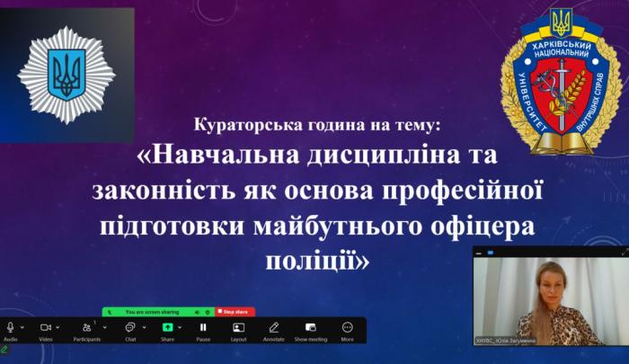 Професорка кафедри теорії та історії держави та права, докторка юридичних наук Юлія ЗАГУМЕННА провела для курсантів 4 курсу навчально-наукового інституту №1 кураторську годину на тему «Навчальна дисципліна та законність як основа професійної підготовки майбутнього офіцера поліції».