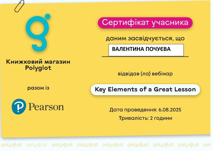 Представники кафедри мовної підготовки – завідувачка Олена СТАТІВКА, доцент Олег ГОНЧАРУК, старші викладачки Валентина ПОЧУЄВА та Лариса САЗАНОВА – долучилися до Міжнародного методичного онлайн-вебінару «Key Elements of a Great Lesson», проведеного сумісно компаніями Pearson та Polyglot. Викладачі кафедри ознайомилися із курсом ‘Wider World 2nd edition for Ukraine’ та ключовими елементами ефективного заняття англійської – системним підходом до планування збалансованих та мотивуючих занять за методом ESA (‘Engage, Study, Activate’ – «Залучення, Навчання, Активація»). Отримана інформація сприятиме максимальному залученню здобувачів освіти у навчальний процес та розвитку продуктивних навичок (‘soft skills’).