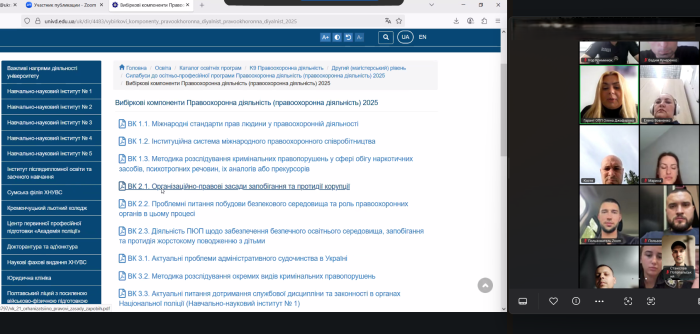 Онлайн-захід провела гарант освітньо-професійної програми, завідувачка кафедри адміністративної діяльності ННІ №3, докторка юридичних наук, професорка Олена ДЖАФАРОВА. Вона представила кожен із запропонованих компонентів, акцентувавши увагу на їхньому практичному значенні та можливостях для поглиблення спеціалізованих знань. Окремо було розглянуто структуру Каталогу. Гарант наголосила, що всі необхідні матеріали містять вичерпний опис кожного вибіркового освітнього компоненту та розміщені на офіційному сайті університету.