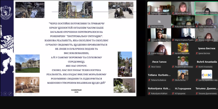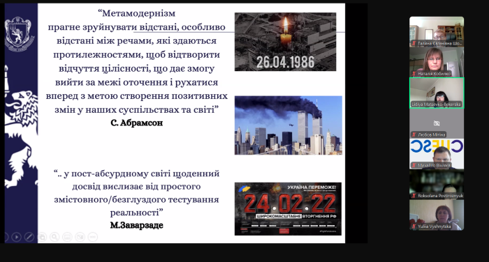 Доцентка кафедри гуманітарних дисциплін та українознавства, кандидатка філологічних наук Наталія КОБИЛКО взяла участь у Всеукраїнському науково-педагогічному підвищенні кваліфікації «Метамодернізм у літературі та літературознавстві: “дзеркало в дзеркалі”», організованого Львівським національним університетом імені Івана Франка та Центром українсько-європейського наукового співробітництва. Під час заходу учасники відвідали лекції провідних науковців: «Метамодерн у літературознавстві: сітка метафор у дзеркалах інтерпретацій» (спікерка – Лідія МАЦЕВКО-БЕКЕРСЬКА), «Медійне різноманіття сучасної поезії: потенційні переваги та ризики у дослідженні й викладанні» (спікер – Любомир БОРАКОВСЬКИЙ), «Шлях до сприймання ІНШОГО: національна ідентичність та стереотип (на матеріалі коміксів про Астерікса)» (спікер – Ірина КУШНІР), «Афективні структури в метамодерній прозі» (спікер – Роксоляна КОХАН). Слухачі поглибили свої знання з новітніх літературознавчих досліджень, формування метамодерністської методології у філологічних студіях, дослідницьких експериментів у сприйманні та інтерпретації метамодерного тексту. Також учасники виконували індивідуальну роботу – написання тез, які ввійшли до збірника матеріалів науково-педагогічного підвищення кваліфікації. Наталія КОБИЛКО опублікувала розвідку «Художні особливості щоденника Володимира Вакуленка-К.», де розглянула символіку часових і просторових образів російсько-української війни.