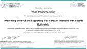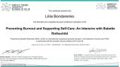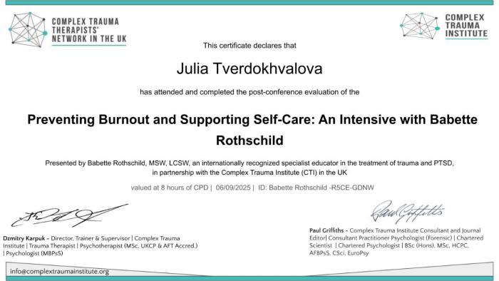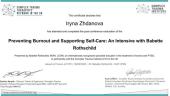 Доцентки кафедри соціології та психології ННІ №5 Ірина ЖДАНОВА, Яна ПОНОМАРЕНКО, Юлія ТВЕРДОХВАЛОВА та Лілія БОНДАРЕНКО взяли участь у вебінарі «Preventing Burnout and Supporting Self-Care: An Intensive with Babette Rothschild», організованому COMPLEX TRAUMA THERAPISTS’ NETWORK IN THE UC. Під керівництвом спікерки, експертки з терапії травми, тілесної саморегуляції та професійного добробуту Бабетт РОТШИЛЬД та її колег Нес БЕАР і Патриції БУРКЕ Д’СОУЗА були опрацьовані сучасні техніки з профілактики професійного вигорання та самодопомоги: тілесна перкусія, балансування, «дерево життя», плейлист «Піднесення». Експертка відповіла на всі запитання слухачів і поділилася своїм клінічним досвідом.