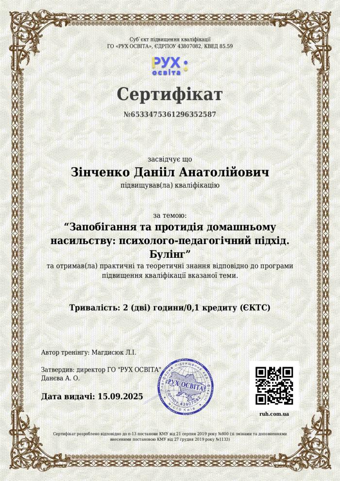Ад’юнкт відділу аспірантури (ад'юнктури) і докторантури Данііл ЗІНЧЕНКО пройшов підвищення кваліфікації за темою: «Запобігання та протидія домашньому насильству: психолого-педагогічний підхід. Булінг». Протягом двогодинного курсу (0,1 кредиту ЄКТС) він здобув теоретичні знання та практичні навички, що відповідають сучасним підходам у сфері протидії домашньому насильству й булінгу. Отримані знання сприятимуть професійному розвитку та впровадженню ефективних методів у науково-педагогічній діяльності.