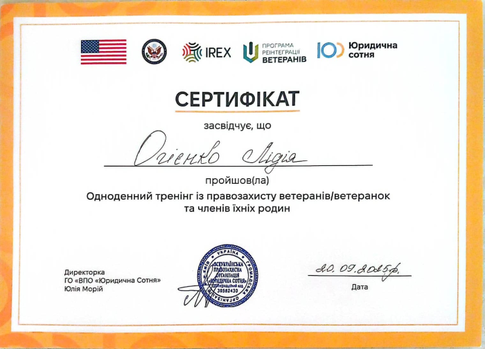 Представниця наукового гуртка кафедри «Актуальні проблеми теорії та історії держави та права», курсантка ННІ №1 Лідія ОГІЄНКО взяла участь у одноденному тренінгу з правозахисту ветеранів і членів їхніх родин, організованому ГО «Юридична Сотня» за підтримки міжнародних партнерів. Захід було спрямовано на підвищення рівня правових знань й практичних навичок учасників у сфері захисту прав ветеранів, ветеранок та їхніх родин. Під час тренінгу обговорювалися актуальні питання правового регулювання соціального захисту, доступу до пільг і гарантій, а також механізми ефективної комунікації між громадськими організаціями та державними інституціями. Участь у таких заходах сприяє розвитку професійної правничої компетентності курсантів, формує навички практичного застосування знань і дозволяє долучатися до вирішення важливих суспільних завдань у сфері підтримки ветеранів.