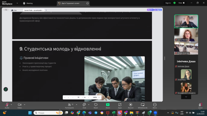 У змішаному форматі відбулося перше засідання наукового гуртка кафедри правоохоронної діяльності ННІ №5, у роботі якого взяли участь завідувачка кафедри Ірина ПАНОВА, доцентка кафедри та координатора гуртка Дар’я ГЛУШКОВА, а також професор Микола ГОЛУБ і доцентка Олена ДОВГАНЬ, які традиційно забезпечують науковий супровід і підтримку студентських ініціатив.
