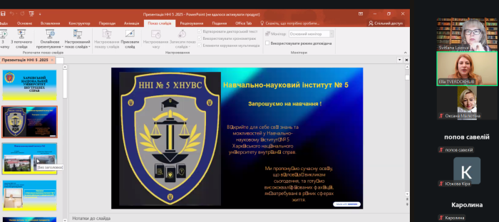 Доцентка кафедри кримінального процесу, криміналістики та судової експертології ННІ №5 Світлана ЛОЗОВА провела онлайн-зустріч з учнями 10-11 класів Покотилівського ліцею «Промінь» Височанської селищної ради Харківського району Харківської області.