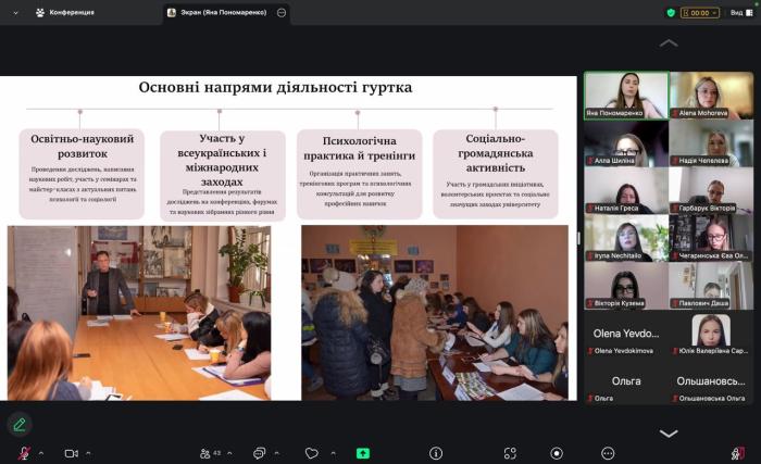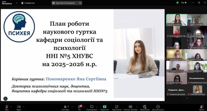 У новому навчальному році відбулося перше засідання гуртка, керівницею якого є доцентка кафедри соціології та психології ННІ №5, докторка психологічних наук, доцентка Яна ПОНОМАРЕНКО. У заході взяли участь завідувачка кафедри, докторка психологічних наук, професорка Олена ЄВДОКІМОВА, професорсько-викладацький склад кафедри та студенти різних курсів.