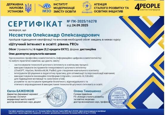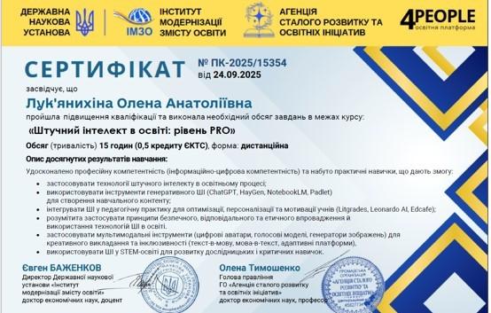 Викладачі вдосконалили вміння працювати з сучасними цифровими технологіями, усвідомили роль штучного інтелекту в освітньому процесі та отримали навички пошуку, аналізу й критичної оцінки інформації, створеної за його допомогою. Окрему увагу приділили академічній доброчесності та етичним аспектам використання інтелектуальних технологій.