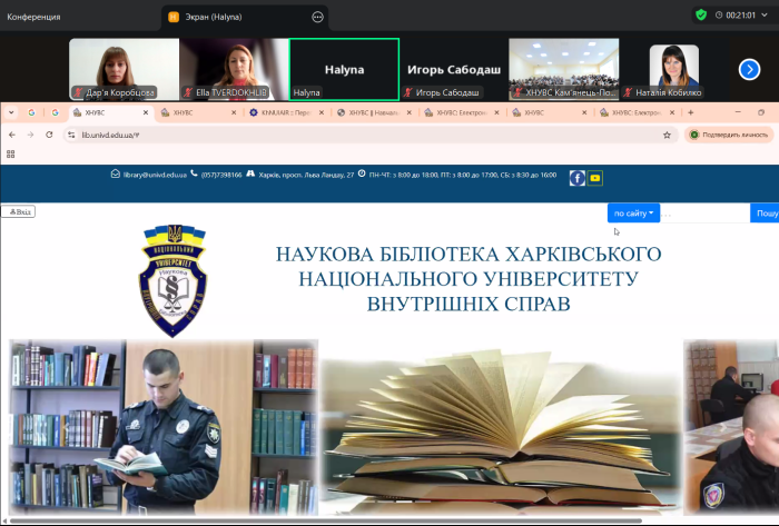 Олена СВІТЛАКОВА представила: електронний каталог із понад 450 тис. бібліографічних записів; електронну бібліотеку, що налічує 115 тис. файлів; репозитарій ХНУВС із близько 21 тис. наукових публікацій авторів університету; електронну патріотичну бібліотеку; бібліотечний портал із дистанційним доступом до всіх ресурсів та сервісів університетської бібліотеки.