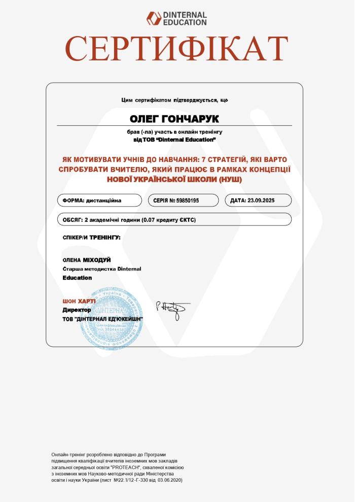 У результаті участі в тренінгу Олег ГОНЧАРУК удосконалив професійну майстерність, зокрема в частині аналізу причин низької навчальної мотивації та застосування різноманітних педагогічних прийомів для її підвищення.