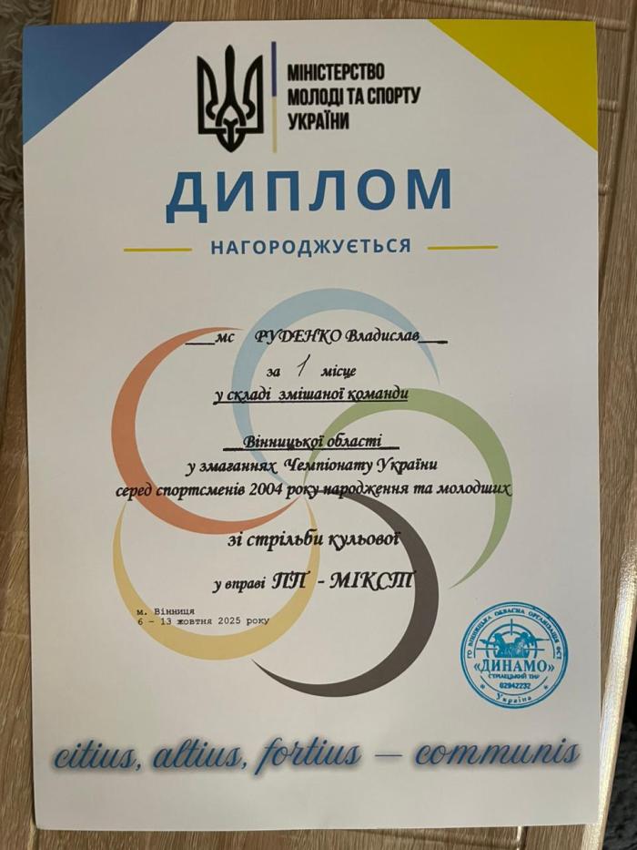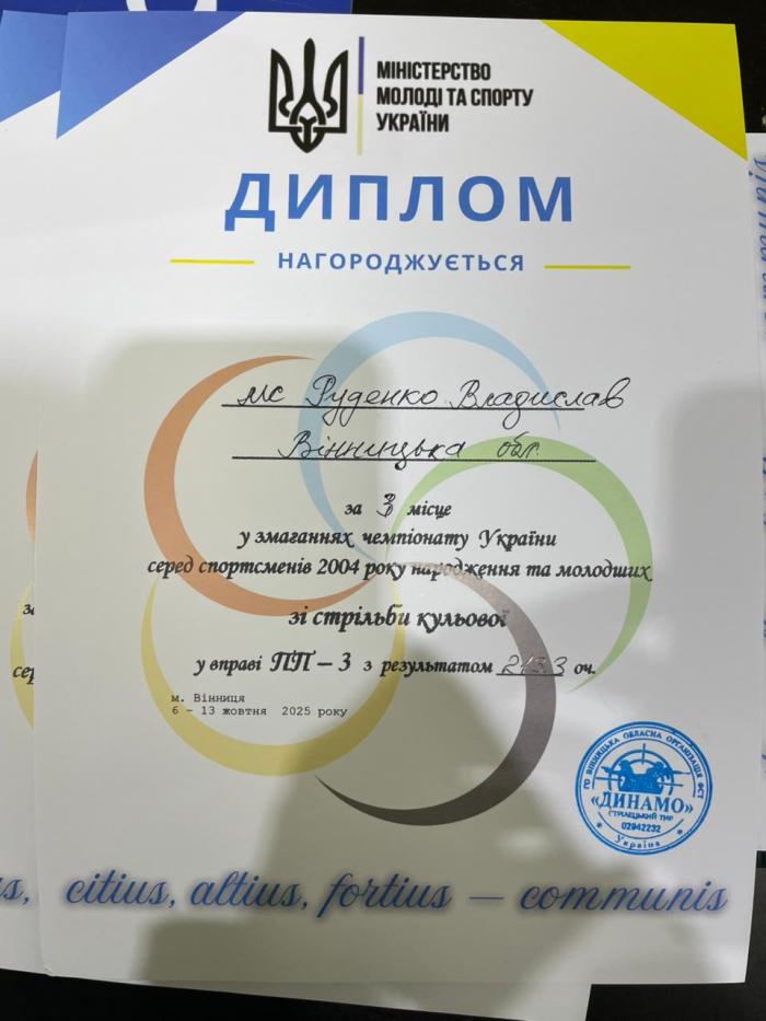 У м. Вінниця відбувся чемпіонат України зі стрільби кульової серед спортсменів 2004 року народження та молодших. У змаганнях взяв участь курсант 2 курсу ННІ №2 Владислав РУДЕНКО. В особистому заліку Владислав став переможцем у вправі ПП-МІКСТ (пневматичний пістолет, змішана команда: чоловік + жінка) у складі збірної команди Вінницької області, продемонструвавши високий рівень майстерності та командної взаємодії. Крім того, він посів ІІІ місце у вправі ПП-3 (пневматичний пістолет, 60 пострілів на 10 м) з результатом 213,3 очка.