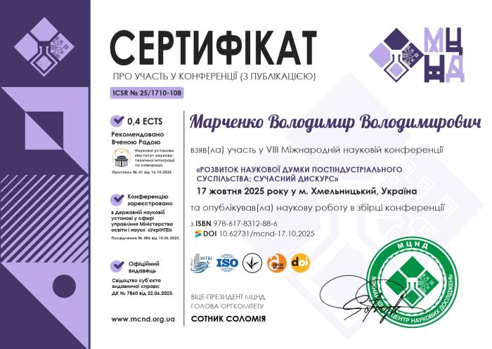 Здобувачка освіти Кароліна ТЕПЛЯКОВА, яка навчається за спеціальністю «Правоохоронна діяльність», взяла участь у VIII Міжнародній науковій конференції «Розвиток наукової думки в постіндустріальному суспільстві: сучасний дискурс», що відбулася у м. Хмельницькому. Під науковим керівництвом доктора юридичних наук, професора кафедри правоохоронної діяльності ННІ №5 Володимира МАРЧЕНКА студентка представила результати свого дослідження на тему «Особливості притягнення неповнолітніх до адміністративної відповідальності в Україні: прогалини та необхідність реформування», які отримали позитивні відгуки учасників конференції за його актуальність та практичну значущість.