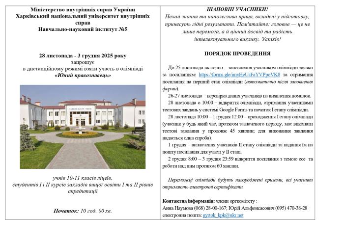 Із 28 листопада по 3 грудня 2025 року ННІ №5 ХНУВС проводитиме дистанційну олімпіаду серед учнів 10-11 класів ліцеїв, студентів І та ІІ курсів закладів вищої освіти І-ІІ рівнів акредитації.