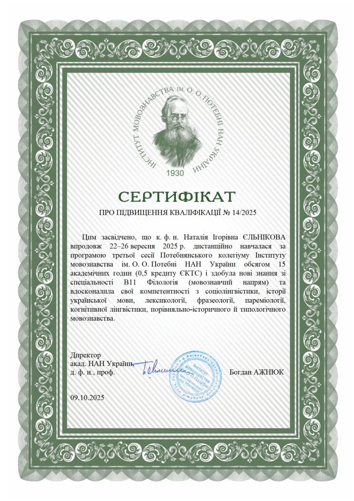 Наталія ЄЛЬНІКОВА та Наталія КОБИЛКО вдосконали свої компетентності з соціолінгвістики, історії української мови, лексикології, фразеології, пареміології, когнітивної лінгвістики, порівняльно-історичного й типологічного мовознавства. Після завершення освітньої програми «Потебнянський колегіум» викладачки отримали сертифікати підвищення кваліфікації.