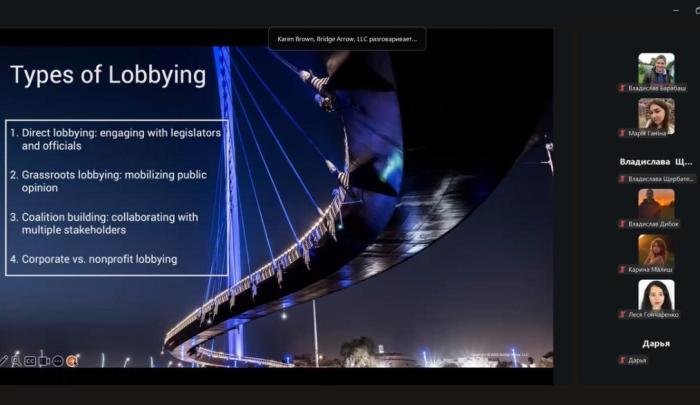 Спікерка зупинилася на характеристиці суб’єктів лобізму у США – внутрішніх лобістів, професійних фірм, груп інтересів і неприбуткових організацій. Вона наголосила, що ефективність лобістської діяльності залежить від професійної підготовки її учасників і дотримання законодавчих процедур.