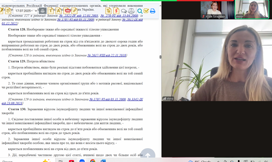 За такою темою для студентів спеціальності «Право» відбулося бінарне заняття, яке провели доцентка кафедри кримінального права та кримінології ННІ №5 Юлія ТАТАРКІНА спільно із запрошеними гостями – прокурором Салтівської окружної прокуратури міста Харкова, кандидаткою юридичних наук Олесею АРСЕНІ та адвокатесою адвокатського об’єднання «Актум» Оленою ЗАЛИВАЦЬКОЮ.