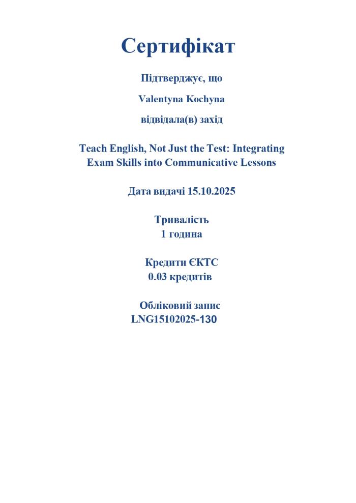 Доцентка кафедри мовної підготовки Валентина КОЧИНА та викладачка цієї ж кафедри Карина ЮЩИШИНА долучилися до Міжнародного онлайн-вебінару «Teach English, Not Just the Test: Integrating Exam Skills into Communicative Lessons», проведеного спікером компанії «Лінгвіст». Викладачки отримала корисну інформацію про те, як навчати англійської повноцінно, знайти баланс у комунікативному підході та зробити знання здобувачів освіти системними. На заході було продемонстровано, як будувати заняття таким чином, щоб природно засвоюювалися навички, необхідні для успішного складання будь-якого іспиту.