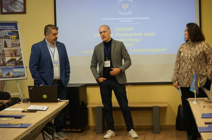 Від КМЄС у зустрічі взяли участь старші радники з питань OSINT Хуан Карлос Аріас ЛОПЕС і Тео МАНДОКІ, а також радник із кримінальних розслідувань Василь БОДНАРЮК. Вони відзначили, що це вже другий тренінг для представників університету – перший відбувся у лютому 2025 року у м. Вінниці. Хуан Карлос Аріас ЛОПЕС повідомив, що цей курс є завершальним у циклі тренінгів з OSINT у 2025 році та висловив сподівання, що учасники поширюватимуть отримані знання серед колег. Тео МАНДОКІ, своєю чергою, підкреслив, що йому приємно співпрацювати з ХНУВС, адже представники університету завжди демонструють високу активність і професійність.