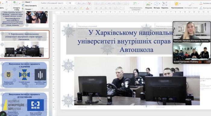 Cтарша викладачка кафедри криміналістики та судової експертології ННІ №1 Катерина ПЕНЗЄВА провела онлайн-зустріч із випускниками Кам’янець-Подільського ліцею №5 та ознайомила їх зі спеціальностями, за якими університет готує фахівців для підрозділів Національної поліції. Зокрема, звернула увагу на особливості навчання для роботи в органах досудового розслідування. Учням випускних класів було надано інформацію про умови навчання та дозвілля курсантів, перспективи розвитку здобувачів освіти ХНУВС в науці, творчості та спорті, можливості пройти курси у безбар’єрній автошколі на отримання посвідчення водія категорії «В», а також про переваги працевлаштування та кар'єрного росту після закінчення університету.