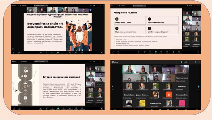 Під керівництвом доцентки кафедри соціології та психології Яни ПОНОМАРЕНКО учасники наукового гуртка обговорили історію міжнародної кампанії «16 днів проти насильства», її ключові цілі та символіку дат, що формують структуру цієї глобальної правозахисної ініціативи.