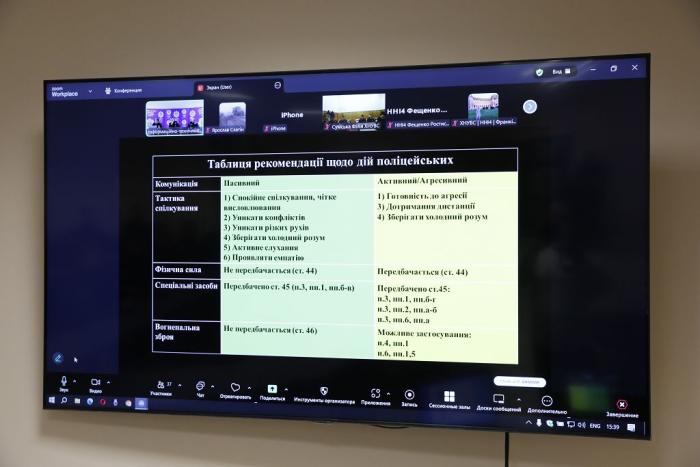 У межах зустрічі було змодельовано захист наукової роботи Олександра ТАРАБАНОВА «Рекогнація стану особи в наркотичному сп’янінні як навичка особистої безпеки поліцейського». Автор представив актуальність, новизну, методологію та основні результати, що викликало жваве обговорення. До дискусії долучився і випускник університету, який зараз виконує бойові завдання на сході України.