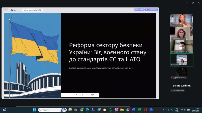 Під час зустрічі учасники обговорили ключові етапи трансформації сектору безпеки в умовах повномасштабної війни, акцентували увагу на стратегічних викликах та пріоритетах переходу України до стандартів НАТО, розглянули роль правоохоронних органів у сучасних безпекових процесах, а також проаналізували практичні приклади здійснених реформ та релевантний міжнародний досвід. Учасники гуртка проявили високий рівень зацікавленості, активно долучалися до обговорень та обміну думками, що сприяло формуванню фахового підходу до аналізу актуальних викликів у галузі поліціїстики. Науковий гурток продовжує свою діяльність, спрямовану на розвиток дослідницьких компетентностей здобувачів освіти та їх участь у вивченні сучасних тенденцій реформування сектору безпеки України.