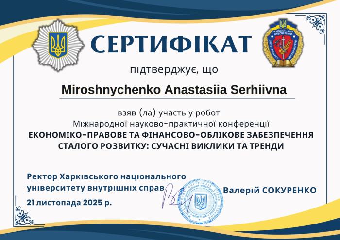 Курсантки другого курсу ННІ №1 Анастасія МІРОШНИЧЕНКО, Олександра ПАВЛЮК, Алевтина ШТОГРІНА, курсант 4 курсу ННІ №4 Володимир ЛІСОВОЛ та їх викладачки – доцентка кафедри мовної підготовки Вікторія ФИЛИПСЬКА і старша викладачка цієї ж кафедри Лариса САЗАНОВА – взяли участь у Міжнародній науково-практичній конференції «Економіко-правове та фінансово-облікове забезпечення сталого розвитку: сучасні виклики та тренди», проведеній Харківським національним університетом внутрішніх справ.