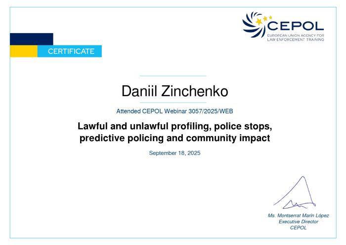За результатами успішного проходження вебінарів Данііл ЗІНЧЕНКО отримав офіційні сертифікати CEPOL, що підтверджують підвищення його професійної компетентності та кваліфікації у сфері міжнародного поліцейського співробітництва та сучасних поліцейських практик.
