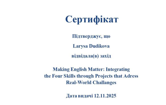 Професорка кафедри мовної підготовки Лариса ДУДІКОВА та викладачка цієї ж кафедри Карина ЮЩИШИНА взяли участь у міжнародному онлайн-вебінарі «Making English Matter: Integrating the Four Skills through Projects that Address Real-World Challenges», організованому представником компанії «Лінгвіст».