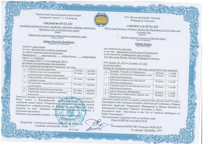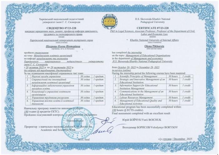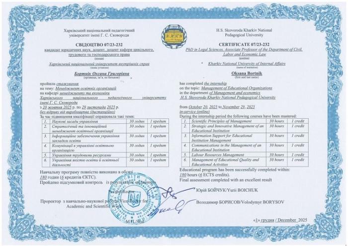 Науково-педагогічні працівники кафедри цивільного, трудового та господарського права успішно пройшли стажування «Менеджмент освітніх організацій», організоване Харківським національним педагогічним університетом імені Г. С. Сковороди.