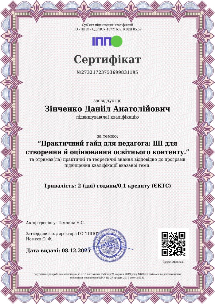 Ад’юнкт відділу аспірантури (ад’юнктури) і докторантури Данііл ЗІНЧЕНКО пройшов онлайн-тренінг, «Практичний гайд для педагога: ШІ для створення й оцінювання освітнього контенту».