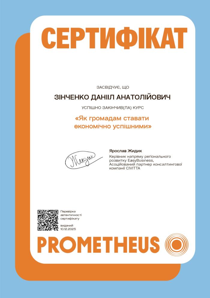 Ад’юнкт відділу аспірантури (ад’юнктури) і докторантури Данііл ЗІНЧЕНКО завершив онлайн-курс «Як громадам ставати економічно успішними», спрямований на формування сучасного бачення розвитку місцевих територій та впровадження ефективних інструментів економічного зростання.