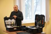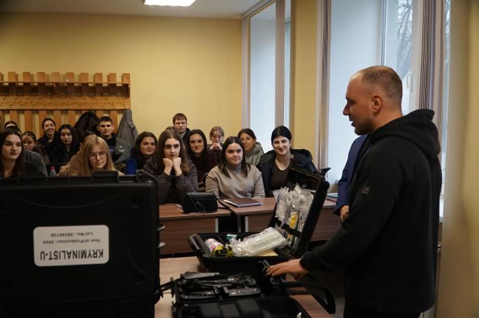 Здобувачам освіти продемонстрували універсальну криміналістичну валізу (вагою близько 15 кг), яка використовується під час огляду місць учинення злочинів, а також спеціальну – призначену для пошуку й відбору біологічних слідів. Окремо показали дрон для огляду великих територій.