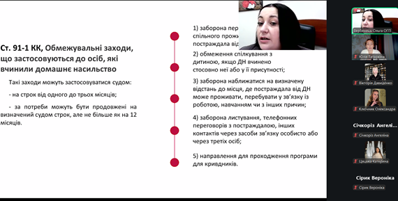 Учасники заняття розглянули питання обмежувальних заходів, серед яких – заборона спільного проживання, що застосовується з метою забезпечення безпеки постраждалої особи та не залежить від майнових прав кривдника. Спікерка наголосила на специфіці кримінального провадження у справах цієї категорії: необхідності оперативного реагування, оцінки ризиків повторного насильства, міжвідомчої взаємодії та особливого процесуального підходу з урахуванням психологічного стану потерпілої особи.
