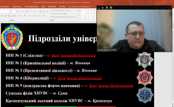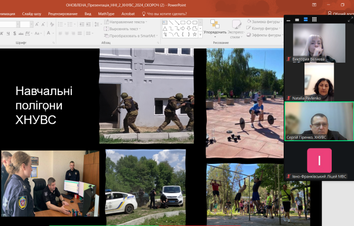 Заступник директора з освітньої та науково-дослідної діяльності навчально-наукового інституту №2 Сергій ГІРЕНКО, завідувачка кафедри соціальних та економічних дисциплін Ірина СЄВІДОВА, професорка кафедри Наталія ПАВЛЕНКО та доцентка кафедри Вікторія ВЕЛІЄВА провели онлайн-зустріч із вихованцями Івано-Франківського ліцею безпекового спрямування та національно-патріотичного виховання імені Андрія Приймаченка МВС України.