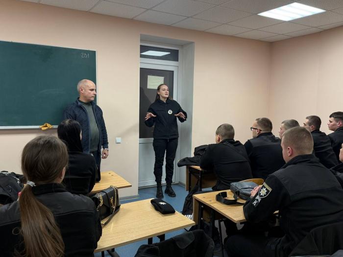 Олена ГОРБАНЬ акцентувала увагу на важливому значенні Національної поліції у захисті, охороні та відновленні прав і свобод громадян, а також у забезпеченні правопорядку в державі, зокрема в умовах дії правового режиму воєнного стану. Крім того, вона ознайомила здобувачів освіти із практикою внутрішнього моніторингу дотримання конституційних прав і свобод у діяльності органів та підрозділів Національної поліції, який здійснюється інспекторами Департаменту головної інспекції та дотримання прав людини.
