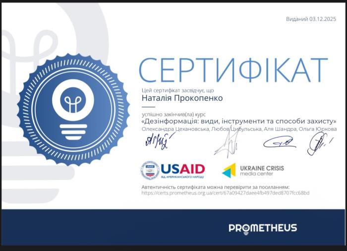 Представники кафедри кримінального права та кримінології навчально-наукового інституту №5 – завідувач Микола Пахнін, професорка Вікторія Давиденко та доцентки Юлія Татаркіна і Наталія Прокопенко пройшли курс «Дезінформація: види, інструменти та способи захисту».