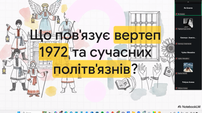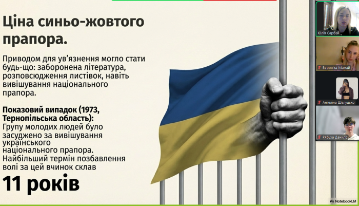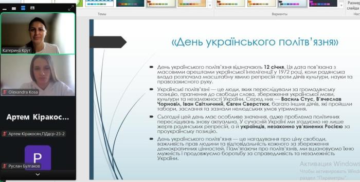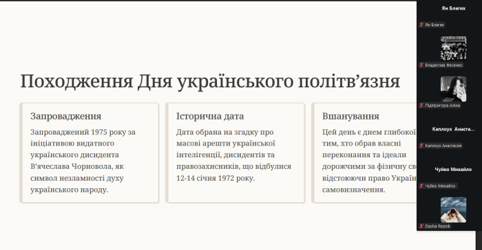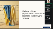 Куратори навчально-наукового інституту №5 провели виховні години зі здобувачами вищої освіти до Дня українського політв'язня. З 12 січня 1975 року за ініціативи В'ячеслава Чорновола в державі вшановується пам’ять українців, які зазнали переслідувань, ув’язнення та репресій за свої переконання, громадянську позицію та боротьбу за свободу й незалежність України. Студенти ознайомилися з історією виникнення цієї пам’ятної дати, дізналися про долі українських політв’язнів різних історичних періодів і виклики, які долали борці за незалежність України. Разом з кураторами здобувачі вищої освіти обговорили важливість усвідомлення цінності свободи, поваги до прав і свобод людини та відповідальності за майбутнє держави.