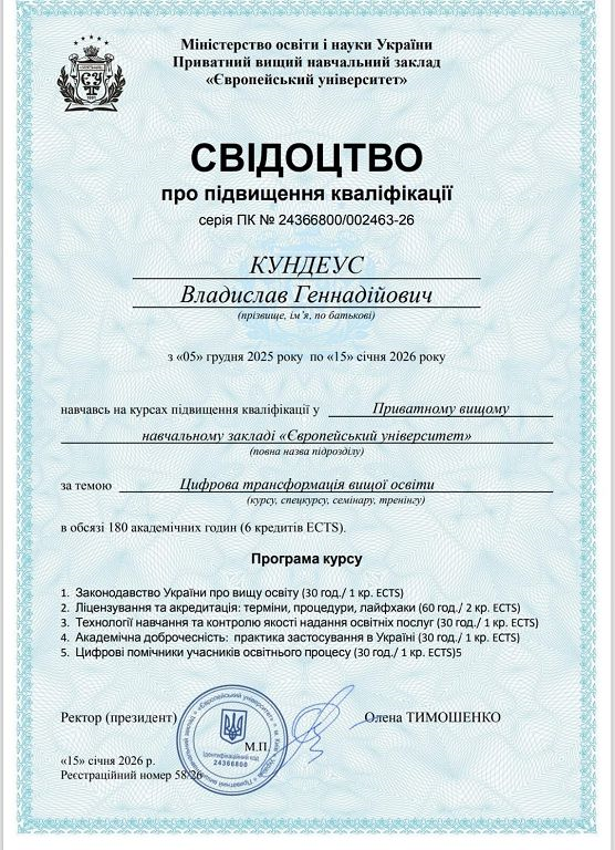 Загалом проходження курсу сприяло поглибленню розуміння процесів цифрової трансформації вищої освіти, удосконаленню професійних компетентностей та набуттю практичних навичок, необхідних для впровадження цифрових рішень у діяльність закладів вищої освіти.